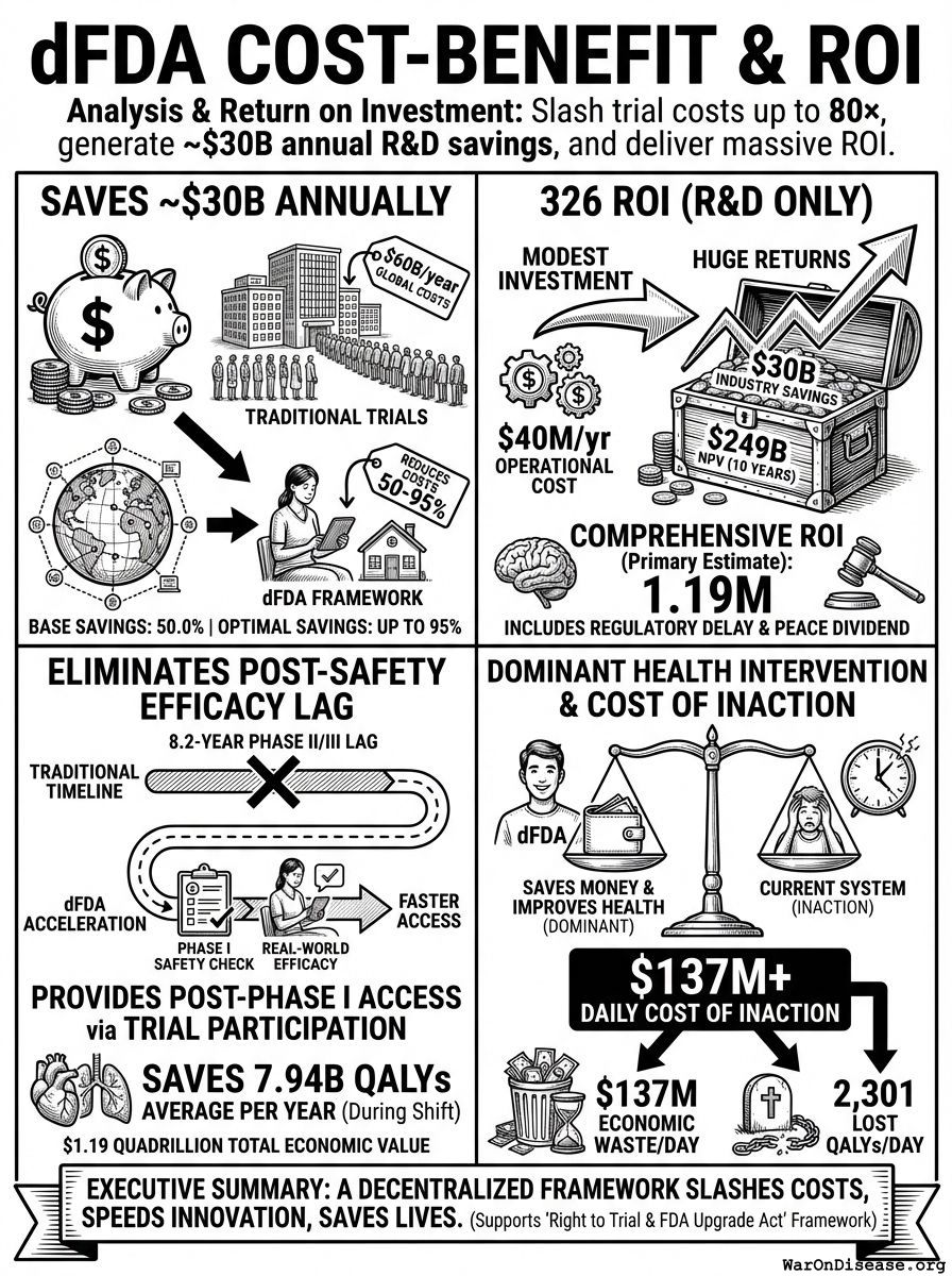 dfda, cost-benefit-analysis, roi, return-on-investment, clinical-trials, drug-development, health-economics, pragmatic-trials, recovery-trial, real-world-evidence, regulatory-efficiency, decentralized-fda