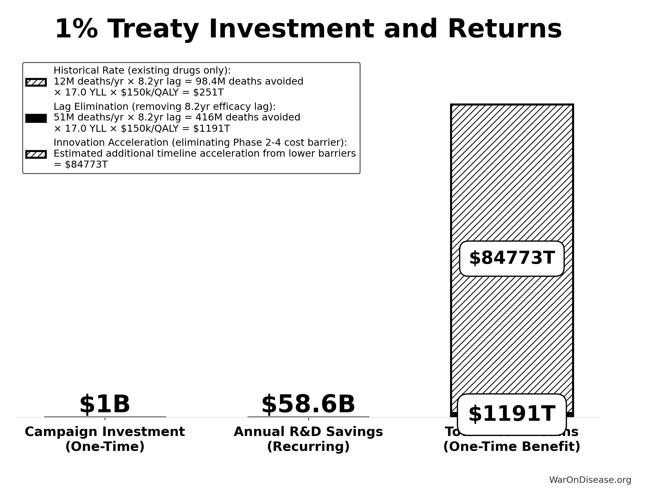 The figures below represent cumulative benefits over the entire acceleration period - the total lives saved by addressing this backlog faster. This is the same methodology used to value smallpox eradication (program cost → total future lives saved) and climate infrastructure investments. These are not annual figures; they are the one-time benefit of permanently accelerating medical progress.