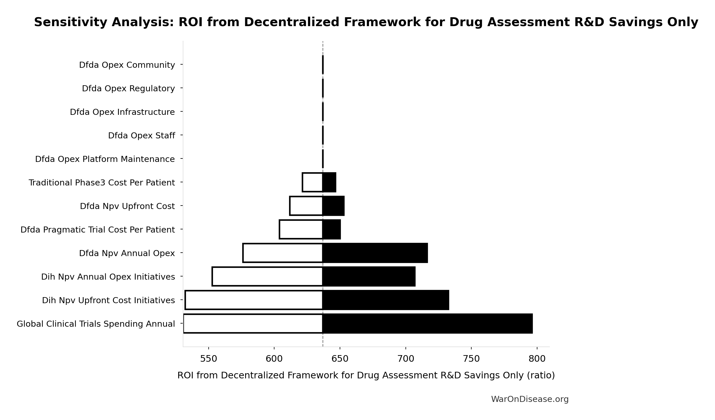 | Decentralized Framework for Drug Assessment | Dominant | Cost-Saving + Health Gain | Dominant | This analysis’s Sensitivity Analysis. Based on $18.9M (95% CI: $11M-$26.5M)-$40M (95% CI: $27.5M-$55.4M) annual costs generating 565B DALYs (95% CI: 361B DALYs-877B DALYs) from ~212 years (95% CI: 135 years-355 years)-year timeline shift. |