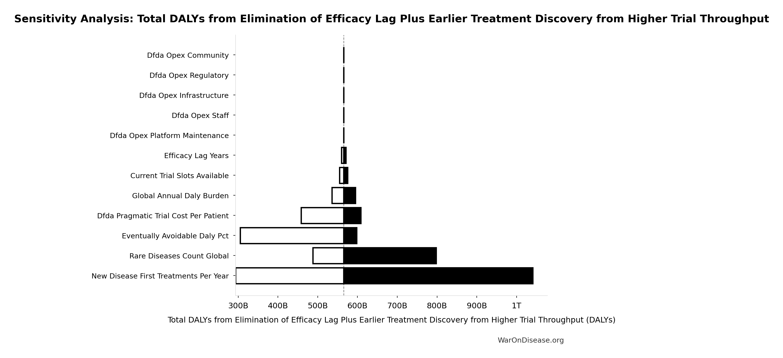 Sensitivity Indices for Total DALYs from Elimination of Efficacy Lag Plus Earlier Treatment Discovery from Higher Trial Throughput