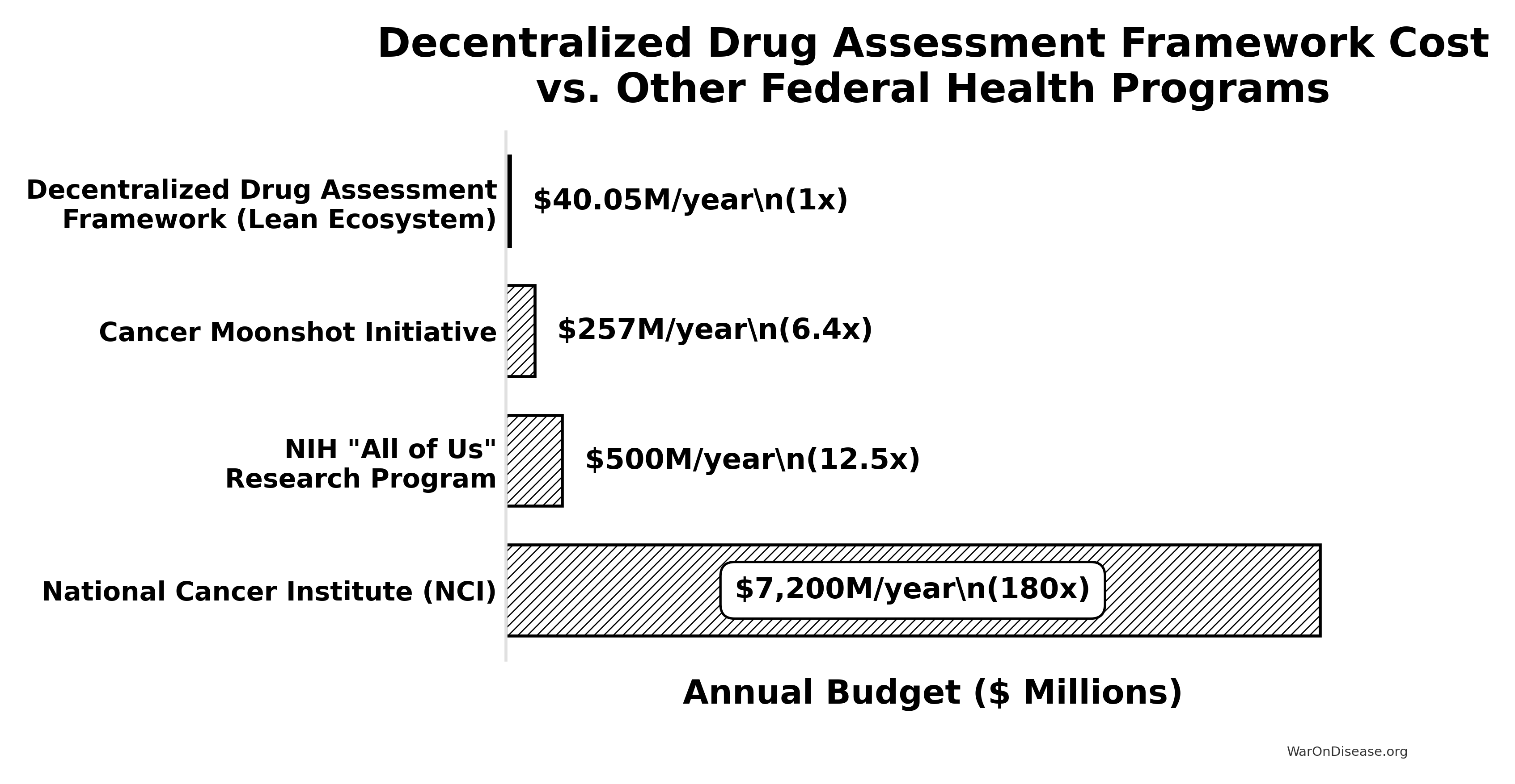 | National Cancer Institute (NCI) | ~$7.2 Billion / year (FY25 Budget) | ~180x | NCI Budget Data |