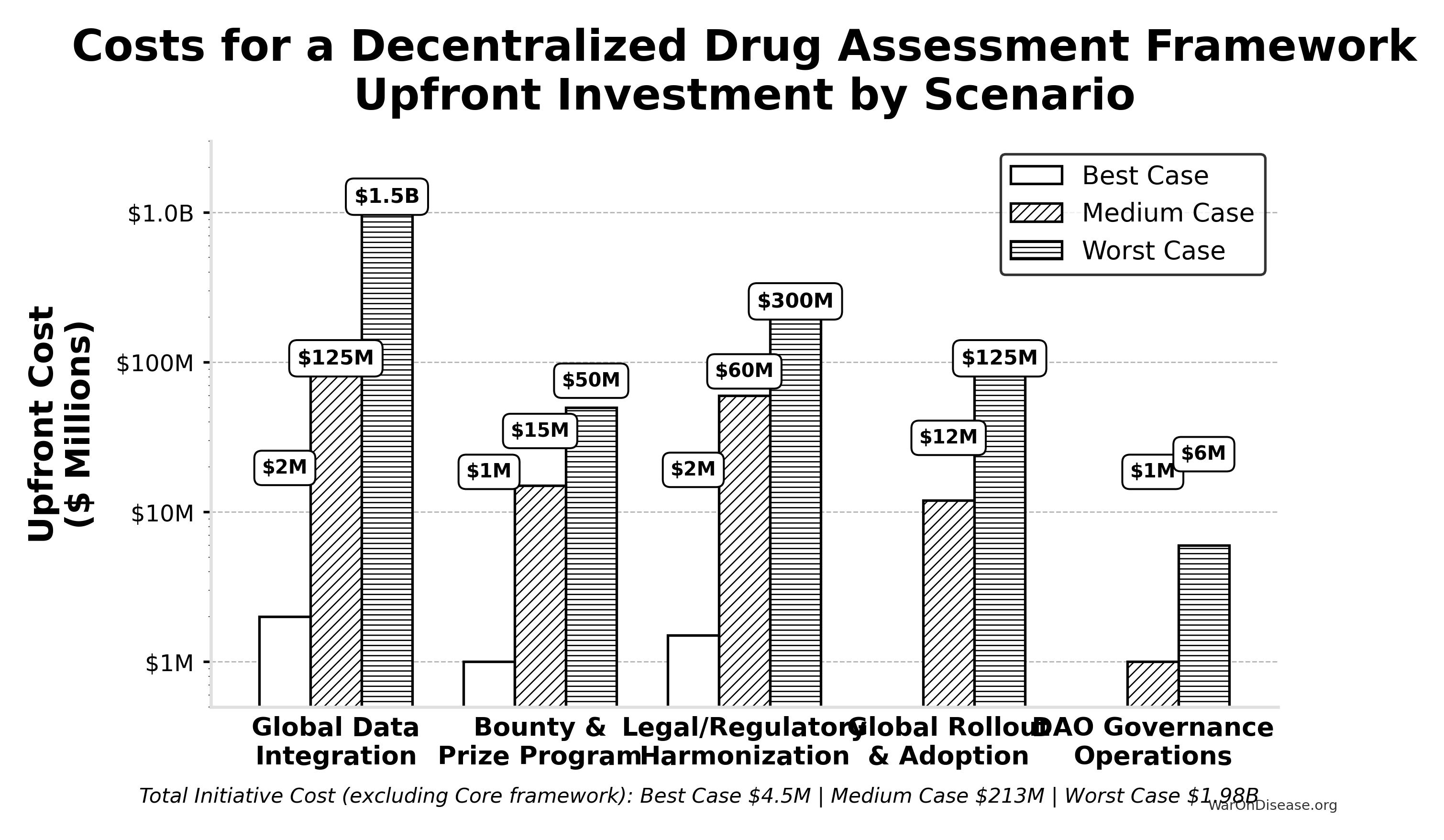 To provide context for the estimated costs of a decentralized framework, it is useful to compare them to other significant U.S. government investments in health and technology. The projected ‘Lean Ecosystem’ cost for a decentralized framework for drug assessment of approximately $40M (95% CI: $27.5M-$55.4M) per year (covering Core framework operations plus medium-scope broader initiatives) is modest in comparison to other major federal projects.